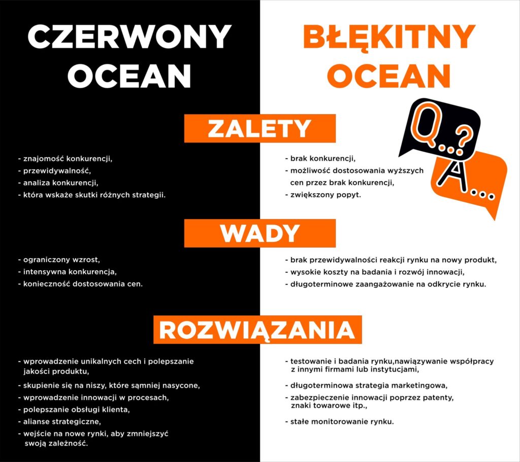 Червоний океан і блакитний океан — це концепції, що описують конкуренцію на ринку. Червоний океан переповнений конкуренцією, де компанії борються за наявних клієнтів, тоді як блакитний океан полягає в створенні нових, незаповнених ринкових просторів. Залежно від конкуренції на ринку можна вжити різні заходи для збільшення своїх шансів.