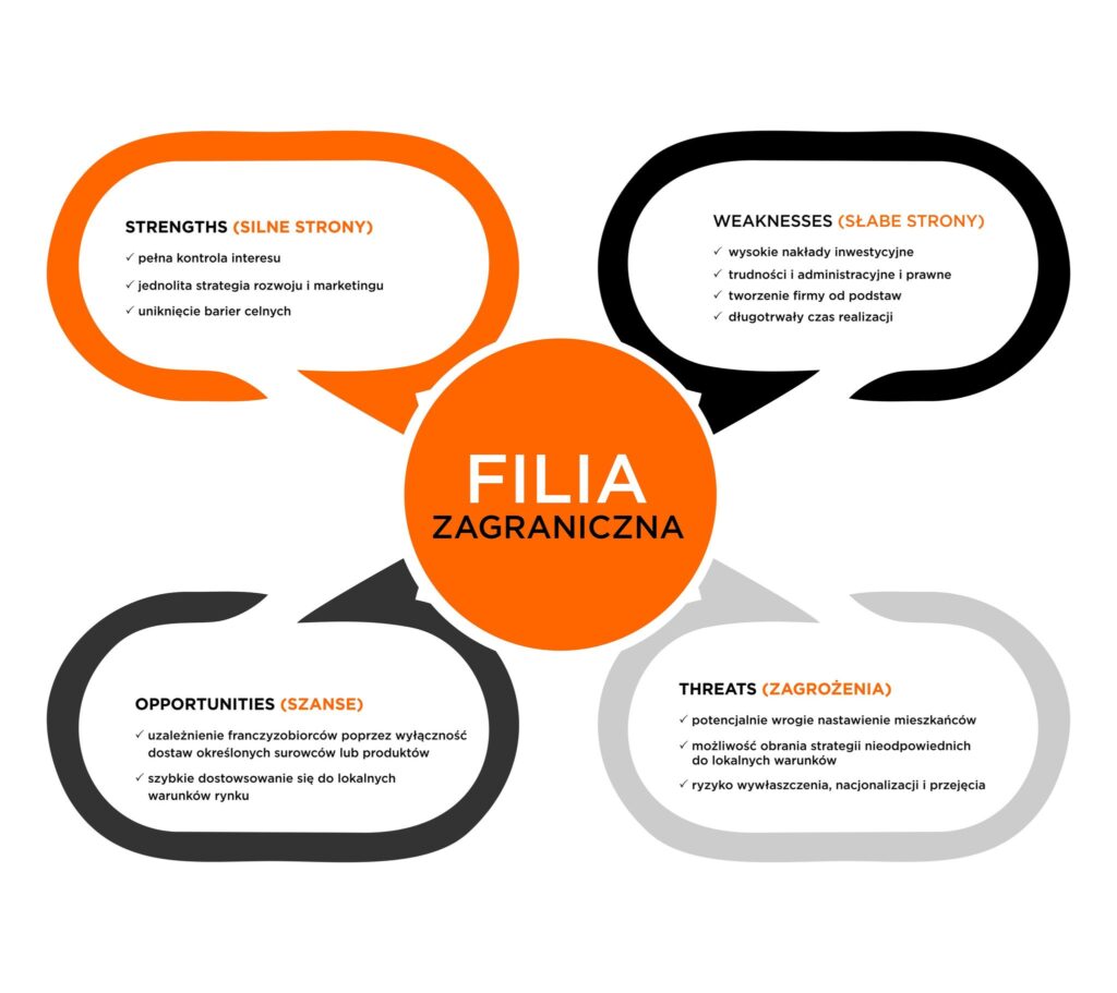 Іноземна філія — це стратегія експансії, що передбачає відкриття, покупку або перетворення відділення в іншій країні. Філія повністю залежить від материнської компанії, що означає, що штаб-квартира зберігає повний контроль над місцевою діяльністю.